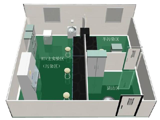 HIV實驗室設清潔區、半污染區、污染區,血清庫可根據實際需要再確定,血清庫與公共區域相通,內門與半污染區相通。
